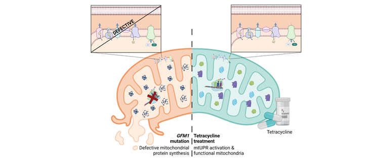 (*) Explicación de la figura: Las mutaciones de GFM1 bloquean la síntesis de las proteínas mitocondriales comprometiendo la producción energética mitocondrial. El tratamiento con tetraciclina activa la UPRmt y mejora la función mitocondrial. Los mecanismos compensatorios celulares pueden servir como dianas terapéuticas en las enfermedades mitocondriales.