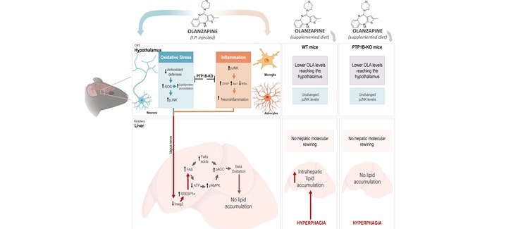 Por otra parte, se han explorado los efectos de la olanzapina en ratones deficientes en la proteína tirosina fosfatasa 1B (PTP1B), un modelo preclínico protegido frente a obesidad. Las autoras destacan el beneficio adicional de la inhibición de PTP1B frente al estrés oxidativo e inflamación inducidos en el hipotálamo por el tratamiento intraperitoneal con olanzapina, previniéndose así la reprogramación metabólica del hígado que conduce al aumento de FAS observado en los ratones de genotipo salvaje.