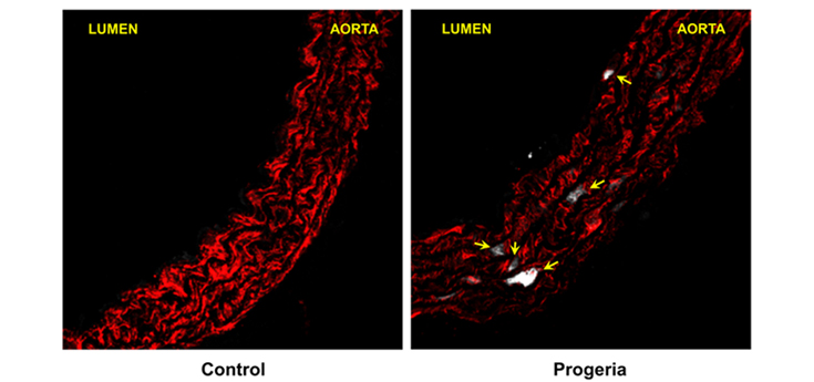 La aterosclerosis es una enfermedad degenerativa que consiste en la acumulación progresiva de colesterol y células del sistema inmune en la pared arterial que, al formar una placa o barrera, obstruye las arterias. La rotura de esta placa aterosclerótica en estadios avanzados de la enfermedad puede provocar la muerte debido a un infarto de miocardio o ictus cerebral. Muchos de los factores que aumentan el riesgo de sufrir enfermedad cardiovascular aterosclerótica pueden controlarse mediante hábitos de vida saludables -alimentación sana, ejercicio físico, no fumar, etc.- y con medicamentos. Sin embargo, el principal factor de riesgo es el envejecimiento, un parámetro que no podemos modificar, situación que se agrava en los pacientes con progeria, cuyas arterias presentan múltiples defectos, incluyendo la pérdida de las células de musculo liso y la formación de placas ateroscleróticas.