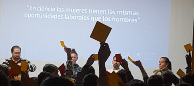 Con todo este preámbulo investigadores e investigadoras dieron respuesta a otros falsos mitos planteados a priori como afirmaciones: “Las carreras de ciencias son más para chicos y las de letras son más para chicas”,"Para ser científica tienes que nacer con vocación y tener cualidades especiales”, “Para ser una gran científica tienes que dedicar todo tu tiempo a la ciencia” o “El lenguaje inclusivo no es importante en ciencia”. Por su parte, los alumnos y alumnas participaron activamente dando su opinión mediante tarjetas de colores en las que podían mostrar su acuerdo o desacuerdo con los mitos que se iban planteando. La mesa concluyó con un un mensaje positivo de cada uno de los/las participantes sobre el papel de la mujer investigadora en la ciencia en el que también resaltaron la importancia de unir fuerzas entre los centros de investigación del CIBER y del CIC para acercar la ciencia a las jóvenes.