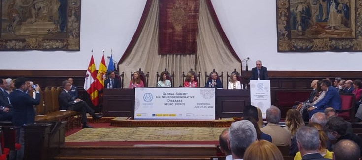 Con motivo del Día Mundial de la Esclerosis Lateral Amiotrófica (ELA), S.M. la Reina Doña Sofía preside este martes el Global Summit Neuro 2020/2022, que aborda los últimos avances de la investigación en Alzheimer y otras enfermedades neurodegenerativas como Parkinson, Huntington y ELA. S.M. la Reina Doña Sofía estará acompañada por la Reina Silvia de Suecia, que con su viaje a España muestra su compromiso con la investigación en este tipo de dolencias. En el acto inaugural participarán además la Delegada del Gobierno en Castilla y León, Virginia Barcones; el alcalde de Salamanca, Carlos Manuel García Carbayo; el rector de la Universidad de Salamanca, Ricardo Rivero; el director científico de la Fundación CIEN y director del Global Summit, Pascual Sánchez Juan; y el director científico del área de Enfermedades Neurodegenerativas del CIBER (CIBERNED),Adolfo López de Munain.