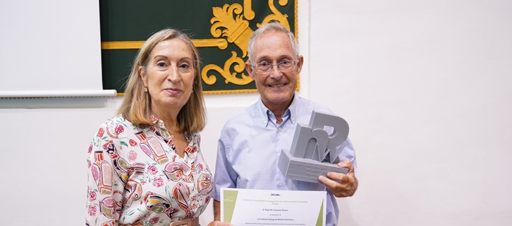 Ángel Carracedo recibe el premio de manos de Ana Pastor.