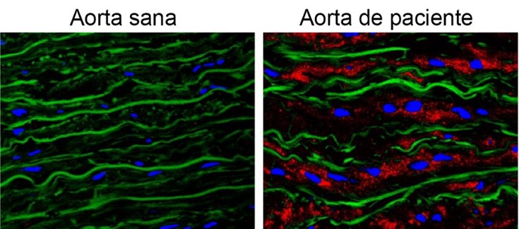 El estudio, dirigido por Juan Miguel Redondo y Miguel R. Campanero, investigadores del CBMSO, ha identificado un aumento significativo de los niveles del proteoglicano Versicano, una proteína del espacio extracelular, en la arteria aorta de pacientes con síndrome de Marfan y en un modelo animal de esta enfermedad (ratones Marfan).
