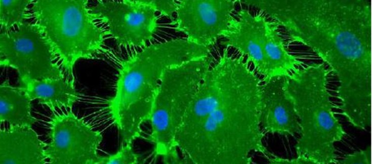 (*) Imagen superior: Sobreexpressión de la proteína de adhesión y marcador endotelial (CD31) en células endoteliales derivadas de pacientes con HPTEC. Imágen de inmunofluorescencia; marcado en (verde) las células endoteliales positivas por CD31 y en azul los núcleos marcados con DAPI.Magnificación x 10.