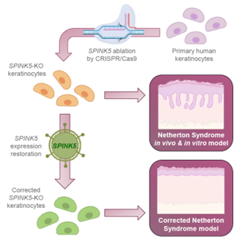 La escisión dirigida del exón 1 del SPINK5 en queratinocitos humanos normales llevó como era previsible a la ausencia de expresión de la proteína codificada por el gen, LEKTI, dando lugar a células que reprodujeron el fenotipo NS tanto in vitro en modelos 3D como in vivo en piel regenerada tras el trasplante a ratones inmunodeficientes. El sistema modelo fue validado a nivel terapéutico mediante una estrategia de terapia génica convencional.