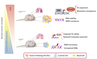 (*) Pie de foto. La eliminación del gen E2A en la glándula mamaria de modelos animales disminuye la expansión de TIC, el crecimiento de tumores y las metástasis pulmonares. E2A regula la expresión del gen Snail1, contribuye a la estabilidad genómica y participa en la resistencia a determinadas terapias antitumorales (inhibidores de PARP-1).