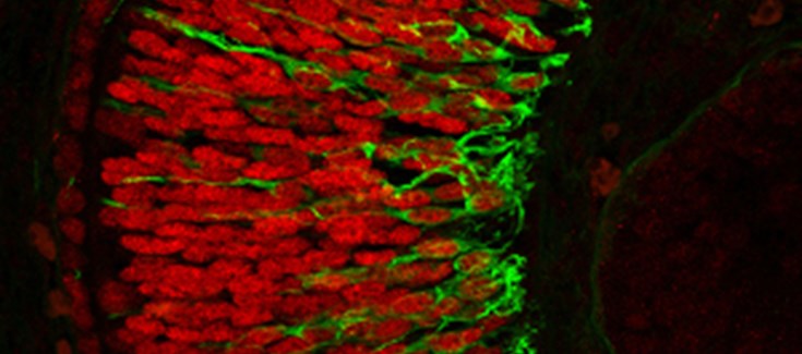 Expresión de Meis1 (en rojo) en la retina de un embrión silvestre y también teñida con un marcador de neuronas (en verde)