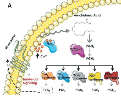 Vía de síntesis plaquetaria de prostanoides. COX-1 es una homodímero bifuncional que cataliza secuencialmente la conversión del ácido araquidónico libre a prostaglandin G2 [PGG2] con su actividad ciclooxigenasa, y después la reducción de PGG2 a prostaglandin H2 [PGH2] con su actividad peroxidasa. A partir de PGH2 se generan los distintos portanoides, incluyendo tromboxane A2 [TXA2] por la acción de la tromboxano sitetasas. |