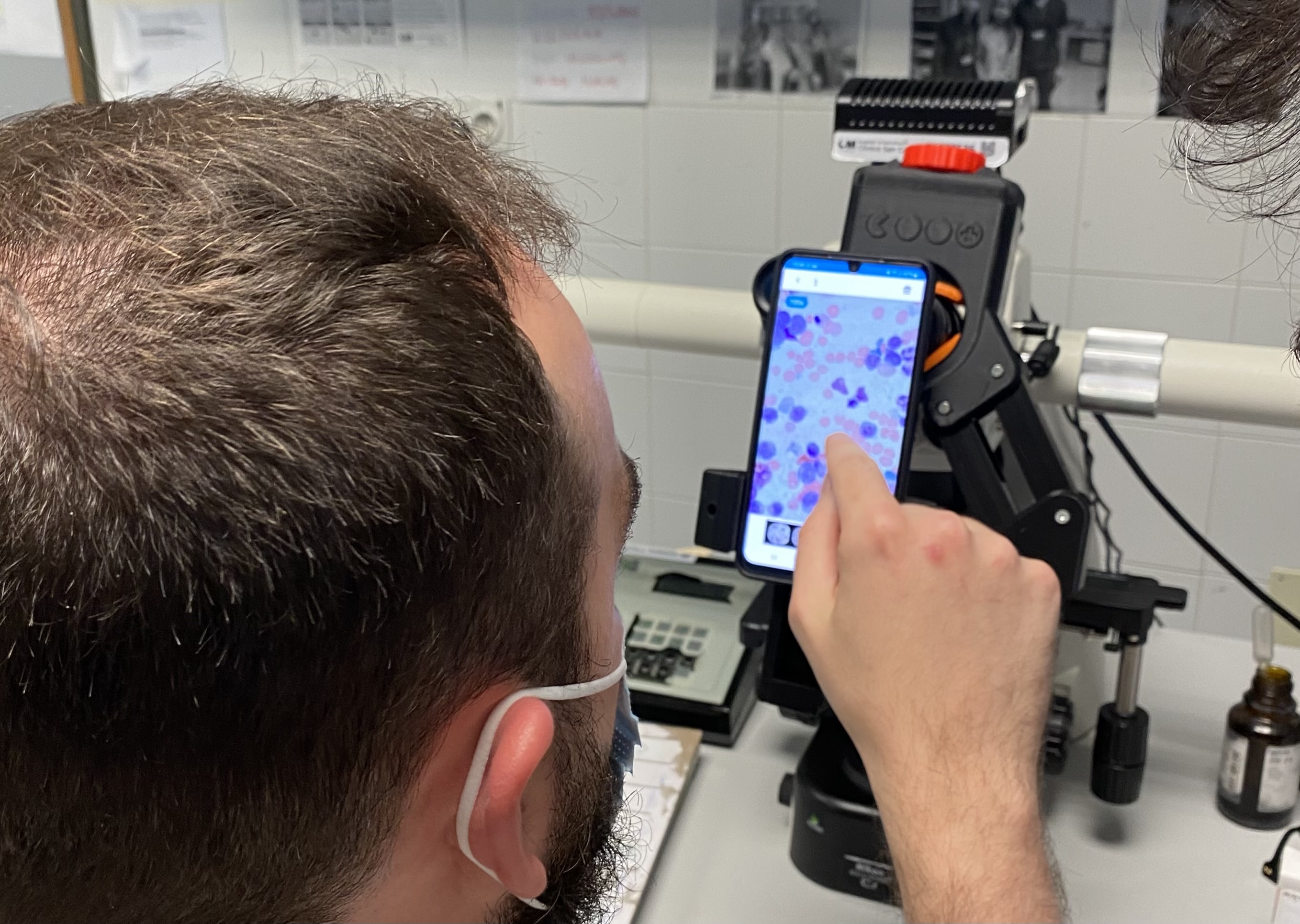 El recuento diferencial de células de los aspirados de médula ósea es una técnica que a día de hoy se realiza manualmente en la mayoría de los centros sanitarios. Esta es una tarea que requiere mucho tiempo y cuyo resultado puede variar dependiendo de la experiencia del observador. Por este motivo, este procedimiento resulta ser un candidato adecuado para ser automatizado gracias a la inteligencia artificial, objetivo de este proyecto multidisciplinar con el liderazgo clínico de Joaquin Martinez del Hospital 12 de Octubre y CIBERONC y en colaboración con el el Hospital Universitario Fundación Alcorcón y el Hospital Vall d’Hebron. “Hemos diseñado específicamente un algoritmo de inteligencia artificial basado en deep learning que es capaz de diferenciar y contar de forma automática diferentes tipos celulares en imágenes de muestras de médula ósea” detalla David Bermejo-Peláez investigador del CIBER-BBN y Spotlab. Para la digitalización de imágenes, el sistema no necesita escáneres ni dispositivos complejos y de alto coste, sino que lo hace utilizando teléfonos móviles inteligentes –smartphones–, lo que lo convierte en un sistema escalable y que puede implementarse en cualquier servicio de hematología de cualquier hospital del mundo.