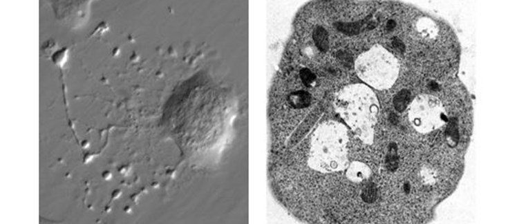 *A la izquierda, una imagen microscópica con contraste de fases de un megacariocito transdiferenciado a partir de células de la piel. El megacariocito fue capturado en un estadio muy maduro, mostrando las típicas proyecciones largas y finas (protoplaquetas) desde donde las plaquetas son liberadas. A la derecha, una plaqueta producida en el laboratorio a partir de la transdiferenciación de células de la piel y visualizada usando microscopía electrónica. El tamaño, la forma y el contenido de estas plaquetas generadas en el laboratorio son remarcablemente similares a las de las plaquetas reales.