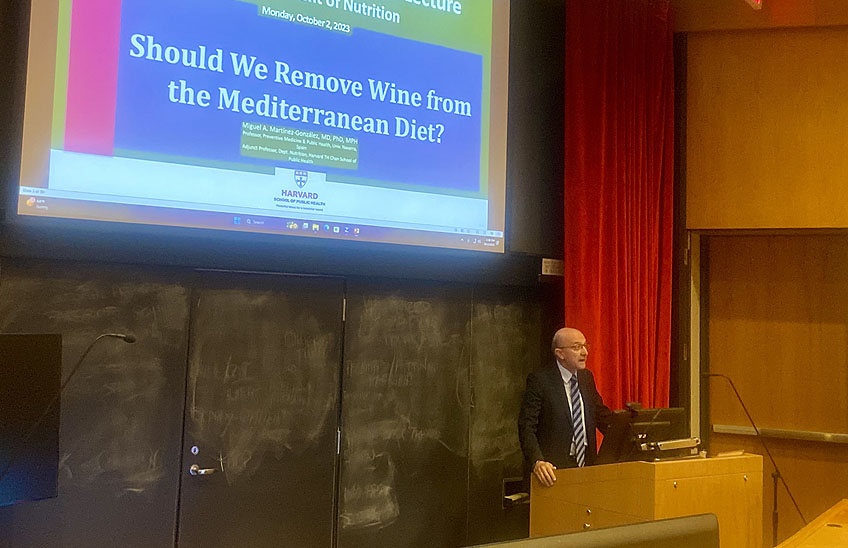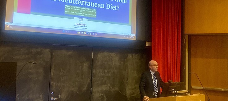 El profesor Miguel Ángel Martínez-González, catedrático de Medicina Preventiva y Salud Pública de la Universidad de Navarra y director del grupo CIBER de Obesidad y Nutrición del Instituto de Salud Carlos III, impartió el pasado 2 de octubre la 18ª Lección Magistral de Nutrición Stare-Hegsted en la Universidad de Harvard, una conferencia titulada "¿Deberíamos eliminar el vino de la dieta mediterránea?". La ponencia contó con la presencia de destacados académicos y profesionales en el campo de la nutrición como Walter Willett, director de la Escuela de Salud Pública de Harvard durante 25 años y actualmente el científico con el mayor registro de publicaciones y el más citado en el mundo en artículos sobre Nutrición. Además, al encuentro asistió un grupo de antiguos alumnos de la Universidad que trabajan o se encuentran realizando estancias de investigación en el centro americano.