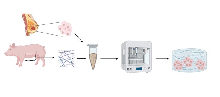 Con el objetivo de recrear esa compleja ECM, el equipo ha utilizado tejido de mama de cerdo hembra, aprovechándose de la gran similitud entre los genomas de cerdos y humanos, y de que es un tejido que se puede obtener de forma sencilla y en gran cantidad. A través de diferentes procedimientos han eliminado las células de cerdo del tejido mamario, dejando solamente la ECM. Ese material, al que llaman biotinta, es el que servirá de base para los pasos siguientes y el desarrollo del tumor en el laboratorio.