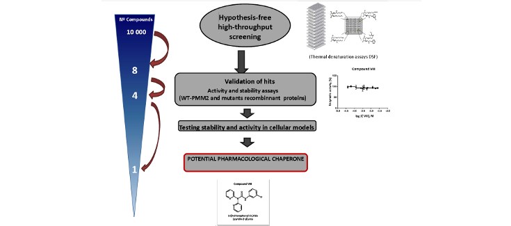 En este trabajo, publicado en Human Mutation, se ha realizado un cribado de 10.000 compuestos para encontrar posibles chaperonas framacológicas útiles para restaurar la actividad de la enzima fosfomanomutasa 2 (PMM2). Las autoras han identificado ocho compuestos que incrementan la estabilidad de PMM2. Cuatro de estos compuestos han funcionado como potenciales PCs que incrementan la actividad de la fosfomanomutasa en un modelo celular de la enfermedad en el que se sobreexpresaron las mutaciones de PMM2-CDG.