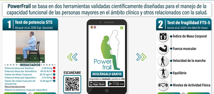 PowerFrail es una aplicación dirigida a evaluar la potencia muscular y la fragilidad en personas mayores, al tiempo que permite proporcionar, en función de los datos obtenidos, intervenciones individualizadas de entrenamiento físico para la mejora de estas condiciones. Esta nueva herramienta de e-Health, desarrollada por investigadores del CIBERFES en el Grupo GENUD Toledo (Universidad de Castilla-La Mancha - UCLM) y el Complejo Hospitalario de Toledo, está ya disponible para dispositivos Android y próximamente también para IOS.