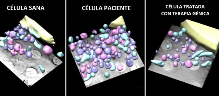 Las imágenes de células de fibroblasto sanas se compararon con las imágenes de células afectadas por la mutación y con las células tratadas con terapia génica, y mostraron como, efectivamente, se habían corregido los trastornos derivados de la mutación en los genes. Remitieron sus efectos y recuperaron la red de colágeno normal entre células, así como los niveles de endosomas y lisosomas.
