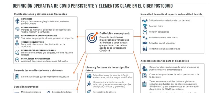Las primeras conclusiones apuntan a un consenso en el uso de la terminología COVID persistente, aunque también se utiliza de manera común post-COVID. La definición conceptual consensuada tras este primer análisis es la siguiente: “Conjunto de síntomas multiorgánicos no atribuibles a otras causas que perduran tras la fase aguda de la infección”. Esta definición, incluye otros componentes o elementos clave y que son similares a otras ya propuestas por organismos como la Organización Mundial de la Salud (OMS), como son las manifestaciones y los síntomas más frecuentes, su curso y evolución, la duración y gravedad, los aspectos necesarios para el diagnóstico, las prioridades en investigación y el estudio del impacto en la calidad de vida de las personas.