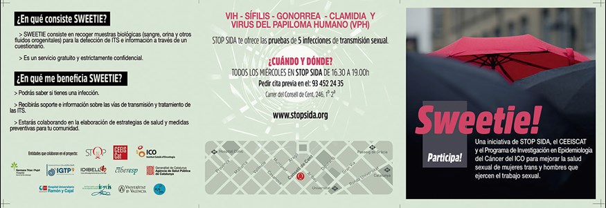 Asimismo, la participación de organizaciones de ámbito comunitario es clave no sólo en la aproximación a las poblaciones vulnerables y el reclutamiento de participantes, sino también en diseño del propio estudio. Es por este motivo que SWEETIE cuenta con la colaboración de la ONG Stop Sida, dedicada a la prevención del VIH / Sida y otras ITS dirigida a la comunidad LGTB + de la ciudad de Barcelona. Y con un programa específico de atención desde y para las mujeres trans y hombres que ejercen el trabajo sexual, Protegersex, donde se ofrece material preventivo gratuito, prueba rápida VIH y Sífilis, asesoramiento individual sobre salud sexual, asesoramiento a trabajadores/as sexuales con VIH, asesoría social y laboral, gestión de la tarjeta sanitaria y empadronamiento y atención psicosocial para quienes consumen sustancias en sus relaciones sexuales.